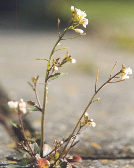 Arabidopsis thaliana, the thale cress, mouse-ear cress or arabidopsis, is a small plant from the mustard family (Brassicaceae), native to Eurasia and Africa. Commonly found along the shoulders of roads and in disturbed land, it is generally considered a weed.A winter annual with a relatively short lifecycle, A. thaliana is a popular model organism in plant biology and genetics. For a complex multicellular eukaryote, A. thaliana has a relatively small genome of around 135 megabase pairs. It was the first plant to have its genome sequenced, and is an important tool for understanding the molecular biology of many plant traits, including flower development and light sensing.