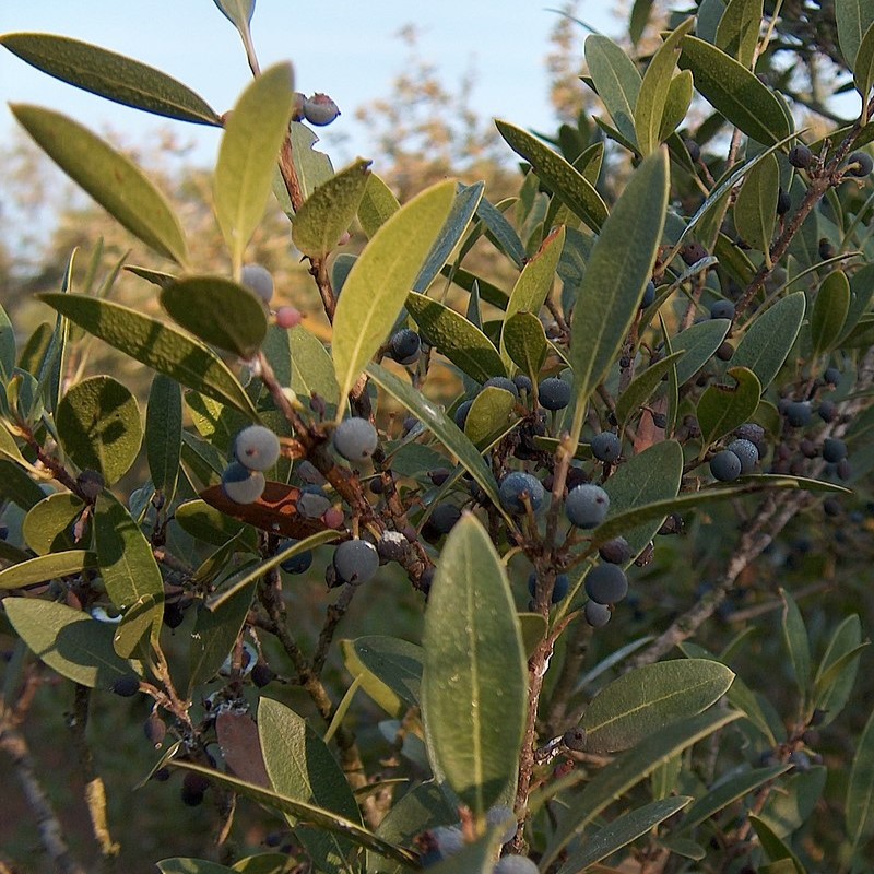 Phillyrea angustifolia, the narrow-leaved mock privet, is a species of flowering plant in the olive family Oleaceae, native to the western and central Mediterranean. It is an evergreen shrub with simple, entire, leathery, dark green, oppositely arranged leaves. Scented creamy-white flowers are borne at the leaf axils in spring and summer, and are followed by purplish black berries. The genus name Phillyrea is derived from Greek and means 'leafy', while the species' epithet angustifolia means 'narrow-leaved'.