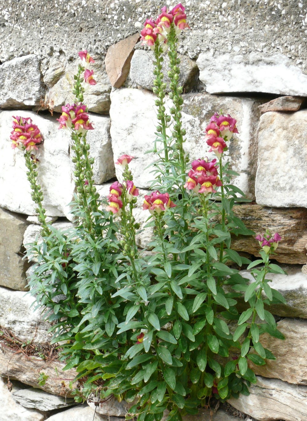 Antirrhinum majus, the common snapdragon (often - especially in horticulture - simply "snapdragon"), is a species of flowering plant belonging to the genus Antirrhinum. The plant was placed in the family Plantaginaceae following a revision of its prior classical family, Scrophulariaceae.