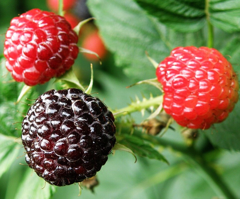 The black raspberry is related to the red raspberry Rubus idaeus and Rubus strigosus, sharing the white underside of leaves, and fruit that readily detaches from the carpel.