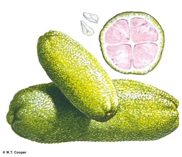 Citrus garrawayi is a shrub or small tree up to 15 m (49 ft), with broad lanceolate leaves. Fruits are elongated, yellowish-green with green pulp. The fruits are edible but the species is rare and grows in an isolated location, so there has to date been no commercial use of it.