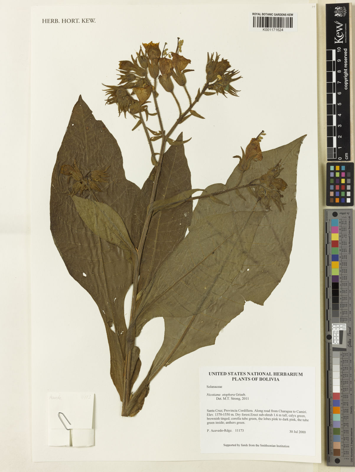 Nicotiana otophora is a perennial herbaceous plant. It is a wild species of tobacco native to the Andes Mountains of Bolivia and Argentina.